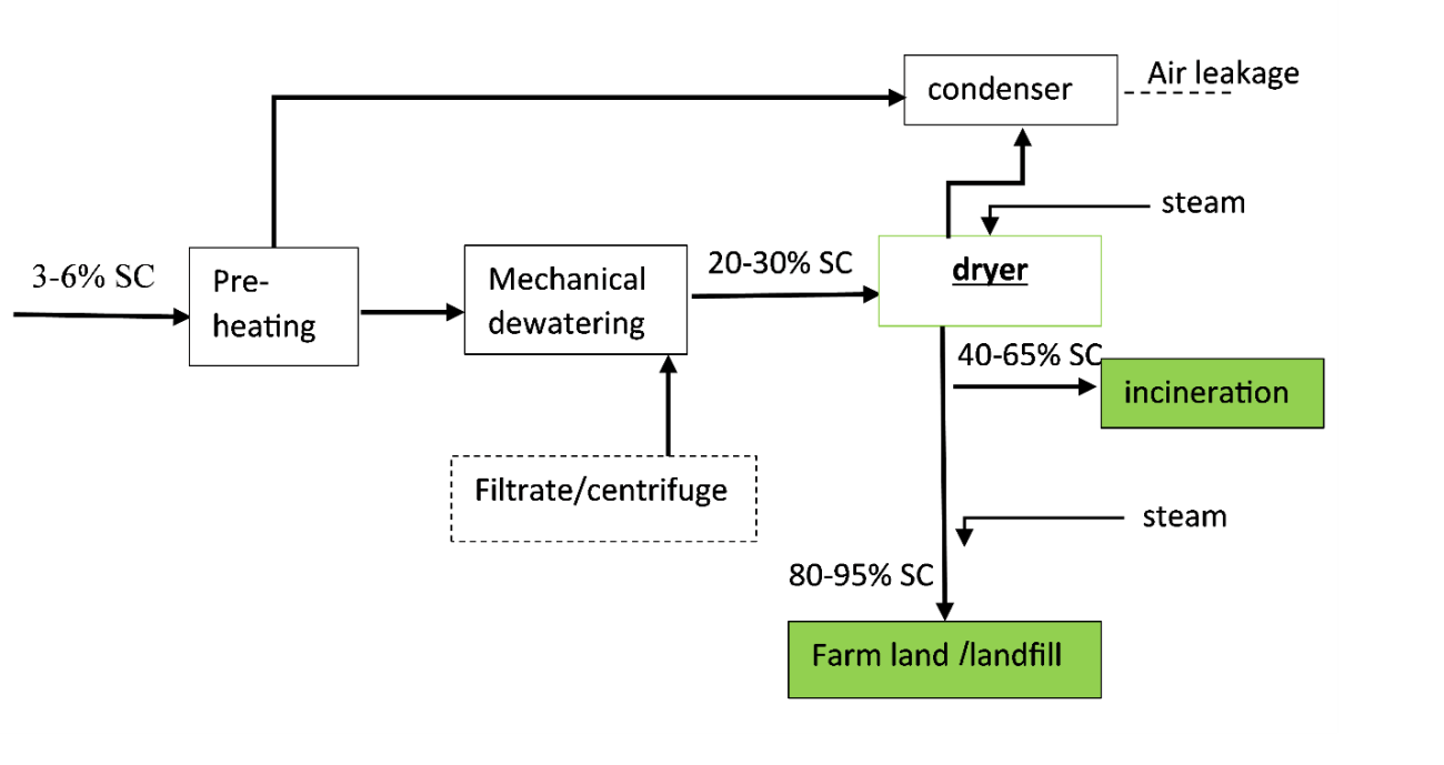 در طول فرآیند خشک کردن، پساب ورودی طی چند مرحله به محصول خشک تبدیل می شود. به طور کلی قبل از استفاده از خشک کردن، آبگیری لجن انجام شده که این امر منجر به کاهش محتوای رطوبت اولیه محصول و کاهش هزینه های این فرآیند می شود. معمولاً آبگیری مکانیکی با استفاده از فیلتراسیون، یا سانتریفوژ صورت می گیرد. آب موجود در لجن می تواند به صورت آب آزاد، آب جذب شده و یا آب درون سلولی وجود داشته باشد.